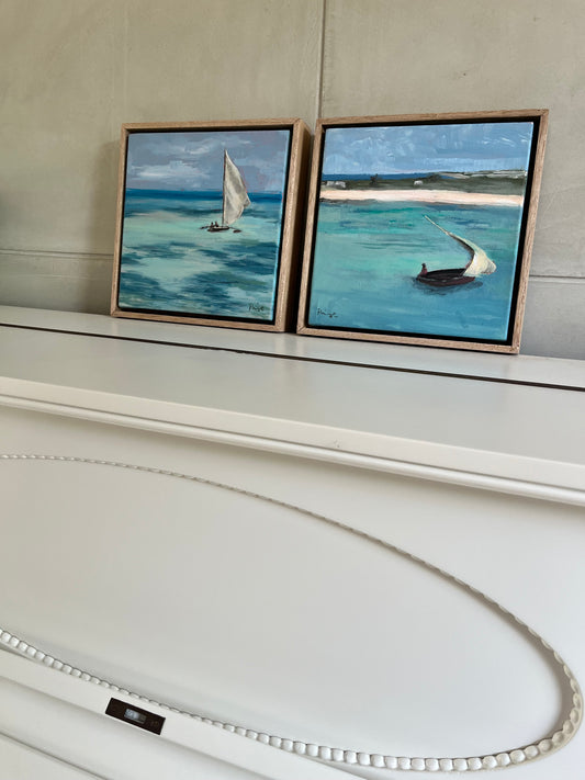 My palette is guided by the world around me: warm sand tones, faded coral, quiet greens, and gentle tropical light. I paint with interiors in mind — art made to complement natural textures, layered spaces, and calm, design-led homes.